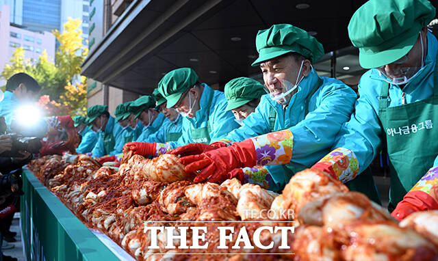 [더팩트ㅣ임영무 기자] 함영주 하나금융지주 회장(오른쪽 두 번째)과 임직원들이 10일 오전 서울 중구 하나금융그룹 명동사옥에서 열린 2025 모두하나데이 '사랑의 김장 나눔' 행사에 참석해 김장을 담그고 있다.darkroom@tf.co.kr사진영상기획부 photo@tf.co.kr