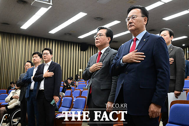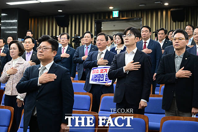 [더팩트ㅣ국회=남윤호 기자] 송언석 국민의힘 원내대표가 10일 오후 서울 여의도 국회에서 열린 의원총회에 참석해 모두발언을 하고 있다.