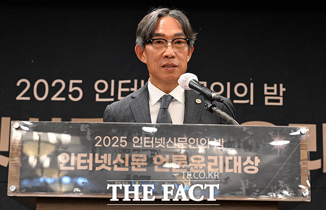 [더팩트ㅣ임영무 기자] 김기정 한국인터넷신문협회 회장이 10일 오후 서울 중구 프레스센터에서 열린 2025 인터넷신문 언론윤리대상에 참석해 개회사를 하고 있다.