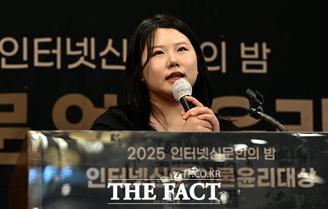 [더팩트ㅣ임영무 기자] 2025 인터넷신문 언론윤리대상이 10일 오후 서울 중구 프레스센터에서 열린 가운데 기자부문 대상을 수상한 더팩트 서다빈 기자가 수상 소감을 밝히고 있다.