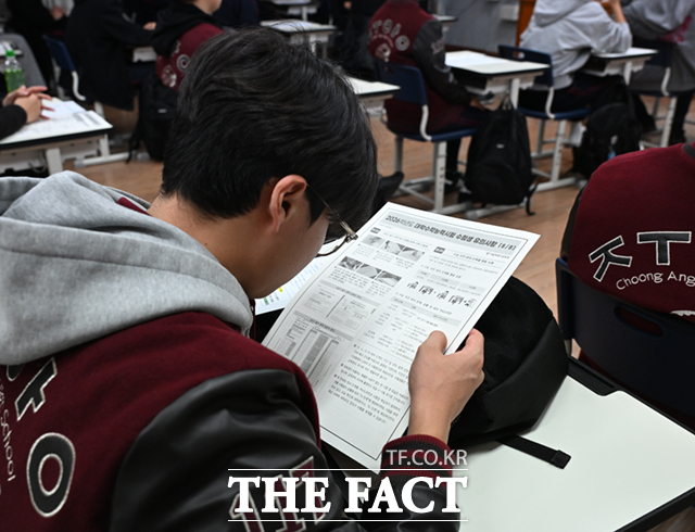 [더팩트ㅣ이새롬 기자] 2026학년도 대학수학능력시험을 하루 앞둔 12일 오전 서울 종로구 중앙고등학교에서 고3 수험생이 수능 유의사항이 담긴 자료를 살펴보고 있다.