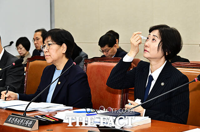 [더팩트ㅣ국회=배정한 기자] 이스란 보건복지부 제1차관이 12일 오전 서울 여의도 국회에서 열린 보건복지위원회 전체회의에 출석해 눈에 안약을 넣고 있다.