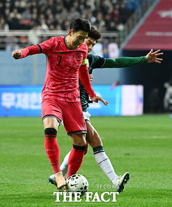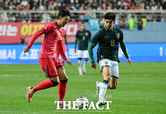 [더팩트|대전월드컵경기장=박헌우 기자] 대한민국과 볼리비아의 평가전이 13일 오후 대전 유성구 대전월드컵경기장에서 열린 가운데 손흥민이 드리블을 하고 있다.