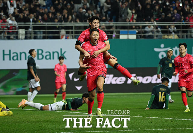 [더팩트|대전월드컵경기장=박헌우 기자] 대한민국과 볼리비아의 평가전이 13일 오후 대전 유성구 대전월드컵경기장에서 열린 가운데 손흥민(왼쪽)과 조규성이 득점 후 기뻐하고 있다.