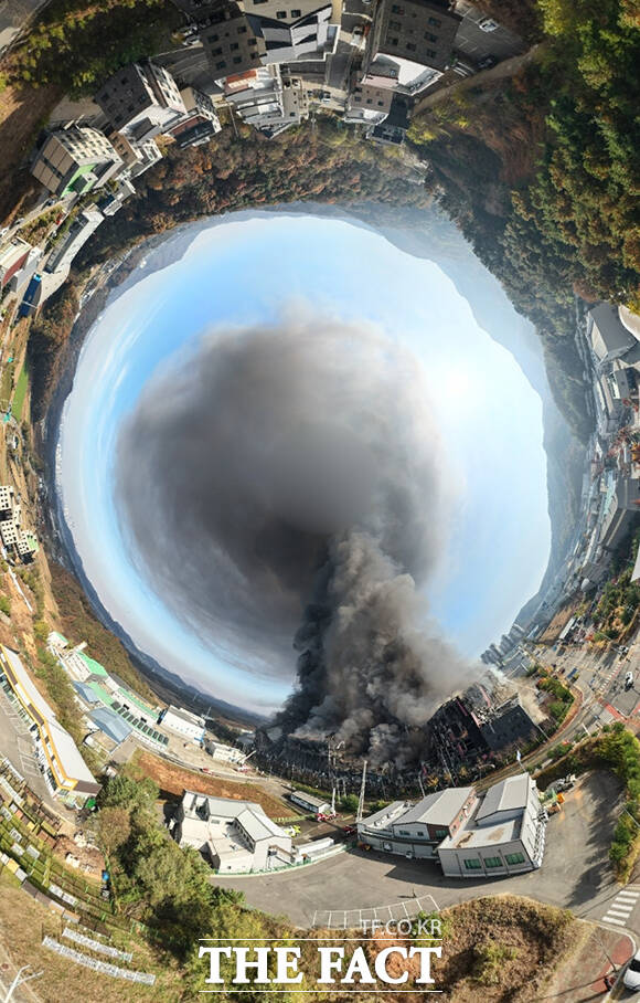 [더팩트ㅣ박헌우 기자] 15일 오전 6시 8분께 충남 천안 동남구 이랜드패션 물류센터에서 화재가 발생한 가운데 검은 연기와 불길이 하늘로 솟구치고 있다.