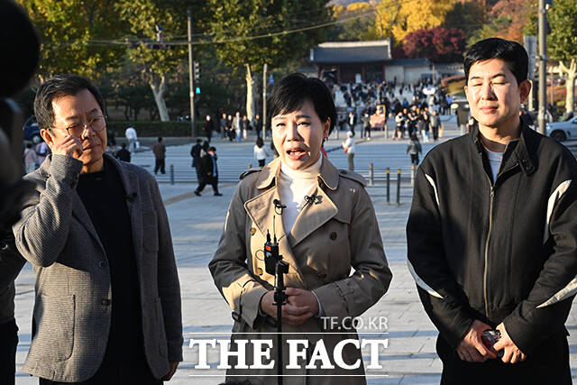 [더팩트ㅣ서예원 기자] 전현희 더불어민주당 최고위원이 15일 오후 서울 중구 세운상가 앞에서 현장 브리핑을 하고 있다.