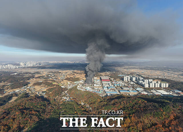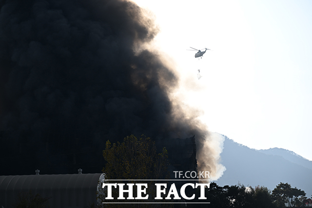 [더팩트ㅣ박헌우 기자] 15일 오전 6시 8분께 충남 천안 동남구 이랜드패션 물류센터에서 화재가 발생한 가운데 검은 연기와 불길이 하늘로 솟구치고 있다.