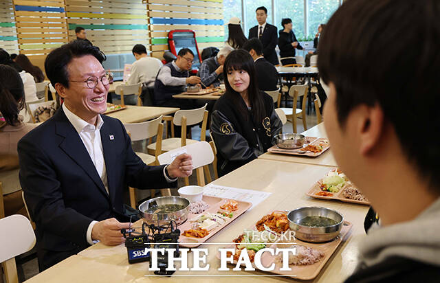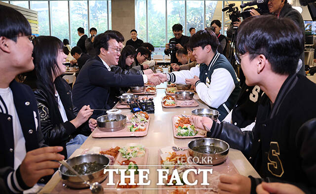[더팩트ㅣ임영무 기자] 김민석 국무총리가 17일 오전 서울 종로구 성균관대학교 은행골식당을 찾아 학생들과 함께 '천원의 아침밥' 식사를 하며 대화하고 있다.