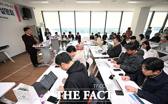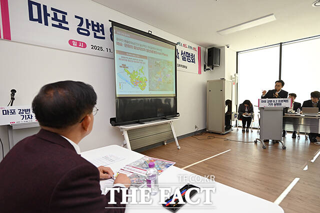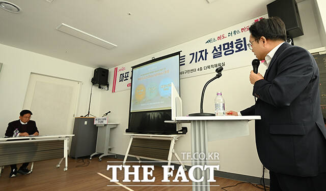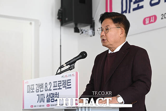 [더팩트ㅣ서예원 기자] 박강수 마포구청장이 18일 오전 서울 마포구 마포365구민센터에서 열린 ‘마포 강변 8.2 프로젝트’ 기자설명회에 참석해 인사말을 하고 있다.