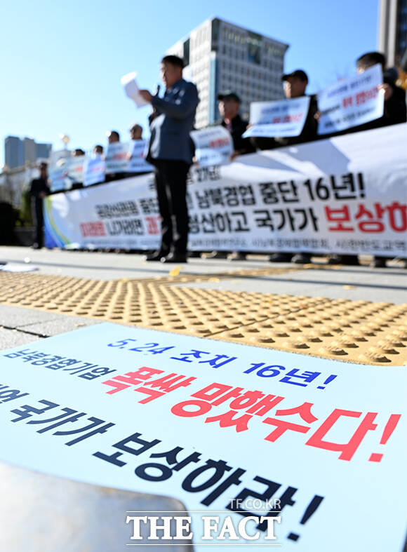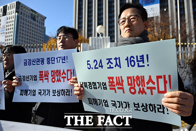 [더팩트ㅣ임영무 기자] 금강산·남북경협기업인들이 18일 오전 서울 종로구 정부서울청사 앞에서 남북경협기업 피해보상 특별법 제정 및 투자자산 보상을 요구하며 구호를 외치고 있다.