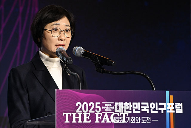 [더팩트ㅣ남용희 기자] 이스란 보건복지부 제1차관이 18일 오후 서울 여의도 FKI 타워에서 열린 '2025 대한민국 인구포럼'에 참석해 축사를 하고 있다.
