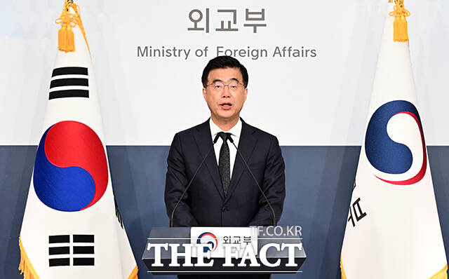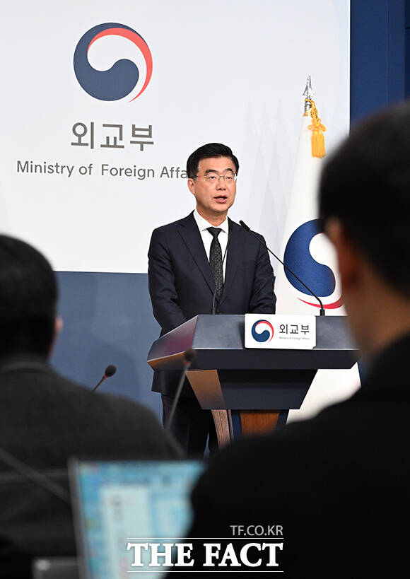 [더팩트ㅣ임영무 기자] 이재웅 외교부 대변인이 18일 오후 서울 종로구 정부서울청사에서 현안관련 정례브리핑을 하고 있다.