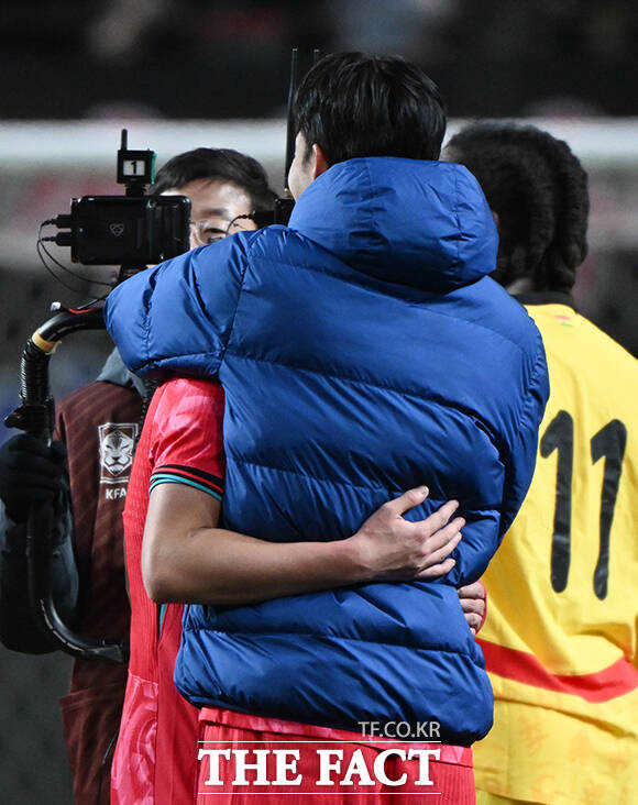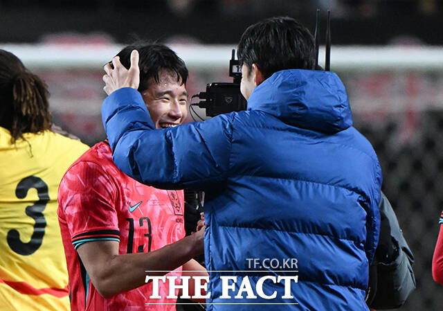 [더팩트ㅣ서울월드컵경기장=박헌우 기자] 대한민국과 가나의 A매치 친선경기가 18일 오후 서울 마포구 서울월드컵경기장에서 열린 가운데 이태석이 선제골을 넣은 뒤 동료들의 축하를 받고 있다.