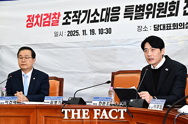 [더팩트 | 국회=배정한 기자] 한준호 더불어민주당 정치검찰조작기소대응특위 위원장(오른쪽)이 19일 오전 서울 여의도 국회에서 열린 정치검찰 조작기소대응특위 전체회의에 참석해 모두발언을 하고 있다.