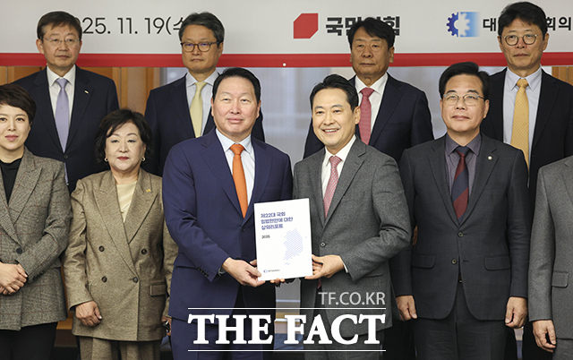 [더팩트ㅣ박헌우 기자] 최태원 대한상공회의소 회장(왼쪽)이 19일 오전 서울 중구 대한상공회의소에서 열린 '국민의힘-대한상공회의소 정책간담회'에 참석해 장동혁 국민의힘 대표에게 정책제안서를 전달하고 있다.