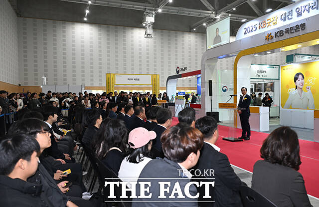 [더팩트ㅣ대전=이새롬 기자] 이환주 KB국민은행장이 19일 대전컨벤션센터 제2전시장에서 열린 '고용노동부와 함께하는 청년의 내일(My Job), 2025 KB굿잡 대전 일자리 페스티벌'에 참석해 환영사를 하고 있다.