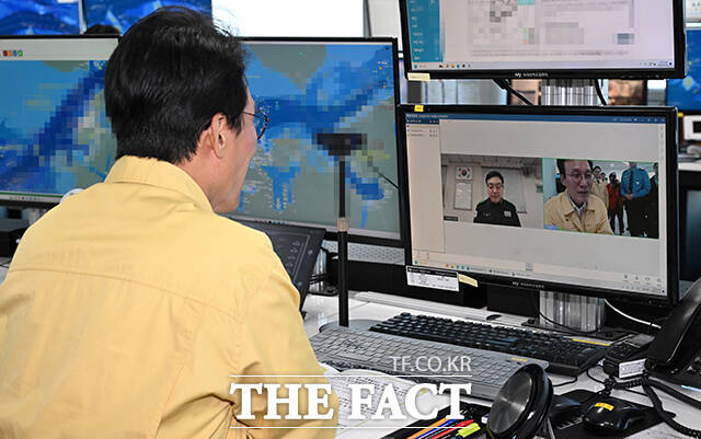 [더팩트ㅣ인천=임영무 기자] 김민석 국무총리가 21일 오전 인천시 중구 인천항 해상교통관제센터(VTS)를 찾아 화상을 통해 해상 출동중인 김기석 함장(해경1506함)을 격려하고 있다. darkroom@tf.co.kr사진영상기획부 photo@tf.co.kr