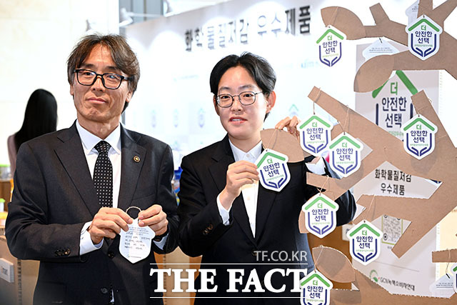 [더팩트ㅣ남용희 기자] 금한승 기후환경에너지부 제1차관(왼쪽)과 조지연 국민의힘 의원이 24일 오전 서울 용산구 서울드래곤시티에서 열린 화학물질저감 우수제품 공개 행사에서 방명록을 작성한 뒤 기념촬영을 하고 있다.