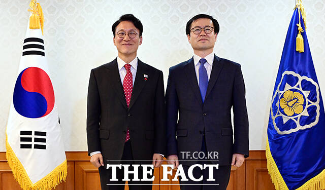 [더팩트ㅣ임영무 기자] 김민석 국무총리(왼쪽)가 25일 오후 서울 종로구 정부서울청사에서 열린 차관급 임명장 수여식에서 여한구 통상교섭본부장에게 임명장을 수여한 뒤 기념촬영을 하고 있다.