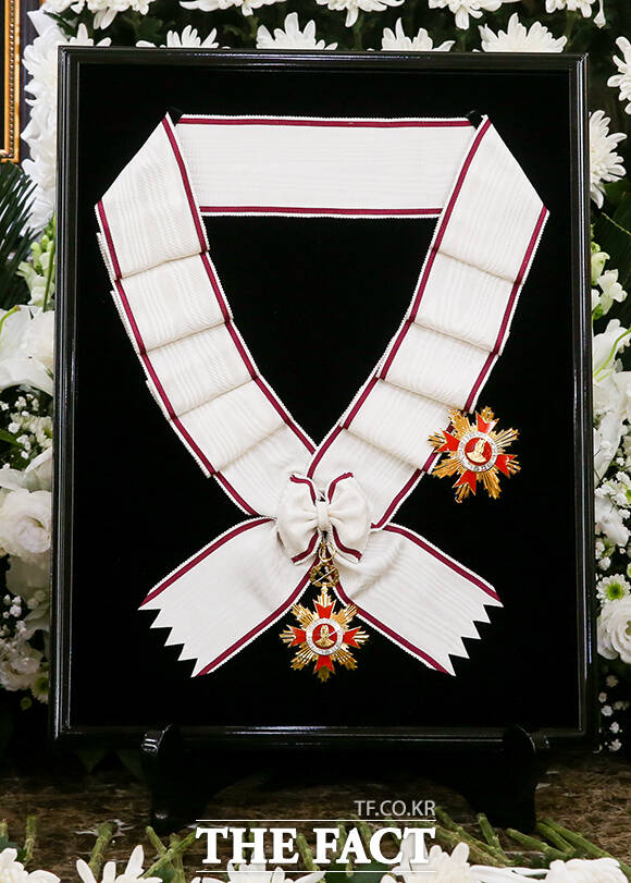 [더팩트ㅣ사진공동취재단] 정부가 고 이순재 배우에게 금관문화훈장(1등급)을 추서한 25일 고인의 빈소가 마련된 서울아산병원 장례식장 영정 옆에 훈장이 놓여 있다.