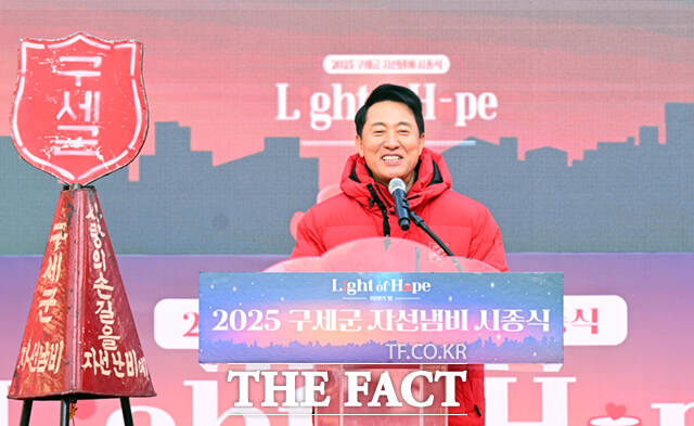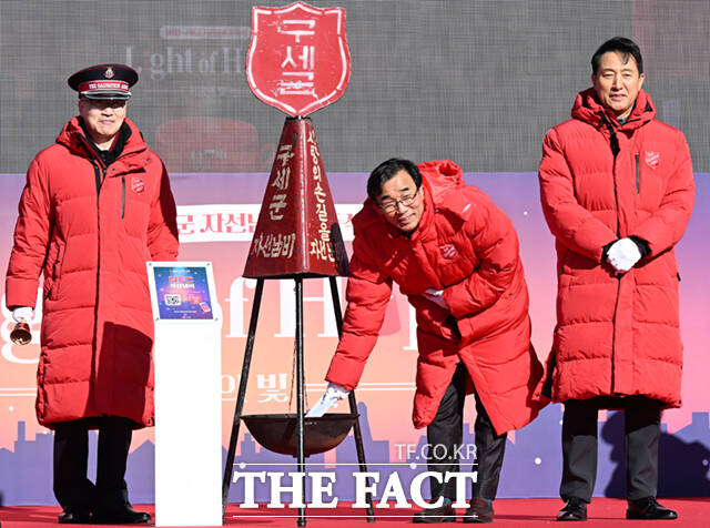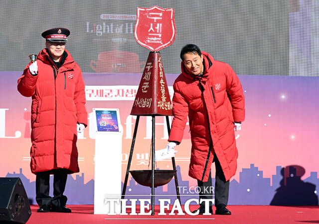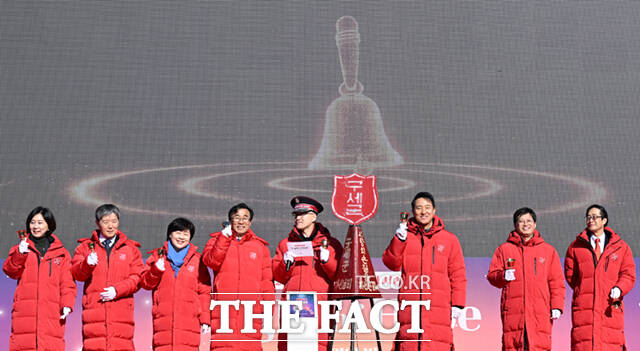 [더팩트ㅣ이새롬 기자] 오세훈 서울시장과 서영교 더불어민주당 의원 등 참석자들이 28일 서울 광화문광장 놀이마당에서 열린 '2025 구세군 자선냄비 시종식'에 참석해 타종 세리머니를 하고 있다.