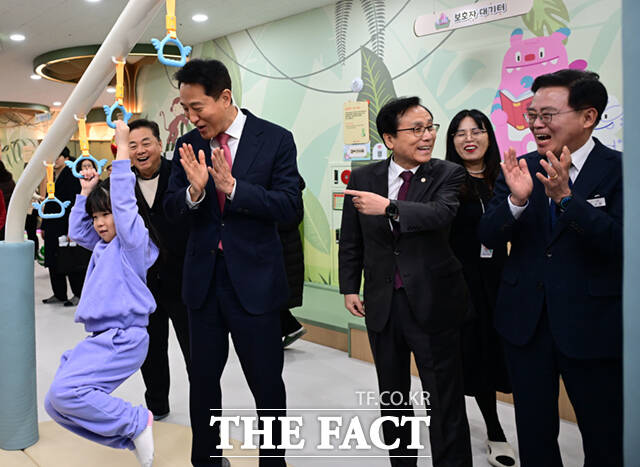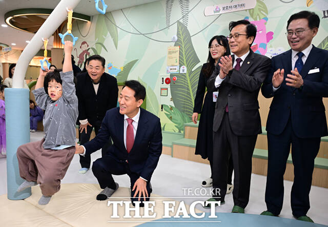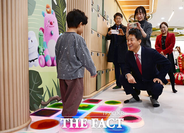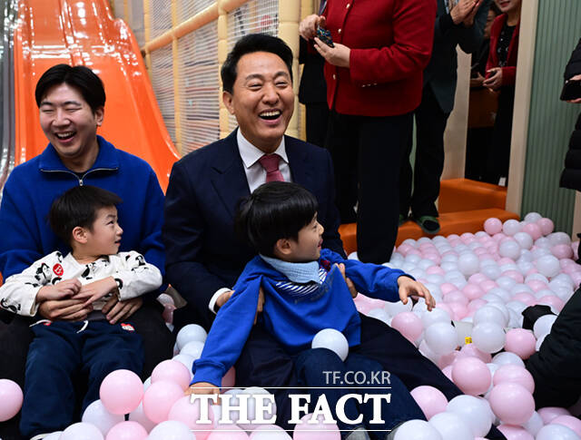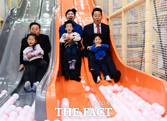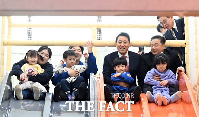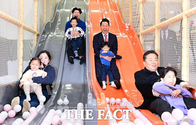 [더팩트ㅣ이새롬 기자] 오세훈 서울시장이 12일 서울 강서구 서울키즈플라자 개관식에 참석해 어린이들과 대형 정글 미끄럼틀을 타고 있다.