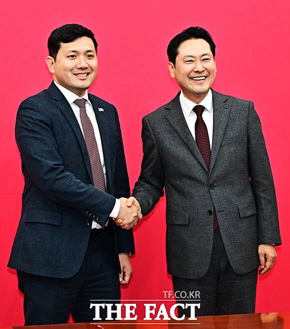 [더팩트 | 국회=배정한 기자] 장동혁 국민의힘 대표가 12일 오후 서울 여의도 국회에서 케빈 김 주한 미국대사대리(왼쪽)를 접견하며 기념사진 촬영을 하고 있다.