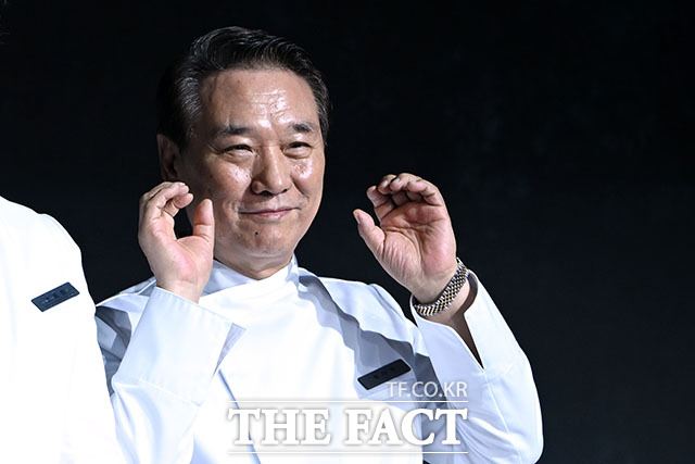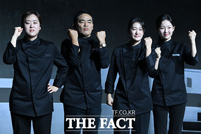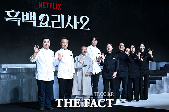 [더팩트ㅣ남용희 기자] 요리사 정호영과 후덕죽, 선재스님, 손종원, 김은지 PD, 김학민 PD, 술 빚는 윤주모, 프렌치 파파, 중식 마녀, 아기 맹수(왼쪽부터)가 17일 오전 서울 종로구 JW 메리어트 동대문스퀘어에서 열린 넷플릭스 예능프로그램 '흑백요리사: 요리 계급 전쟁 시즌2' 제작발표회에 참석해 포즈를 취하고 있다.
