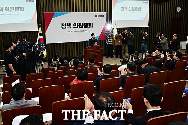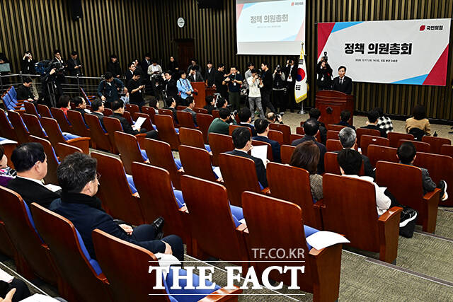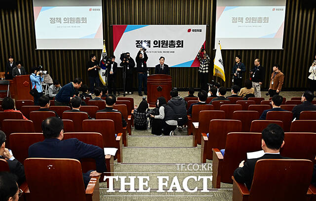 [더팩트ㅣ국회=배정한 기자] 송언석 국민의힘 원내대표가 17일 오후 서울 여의도 국회에서 열린 정책의원총회에 참석해 모두발언을 하고 있다.