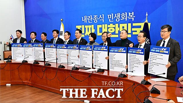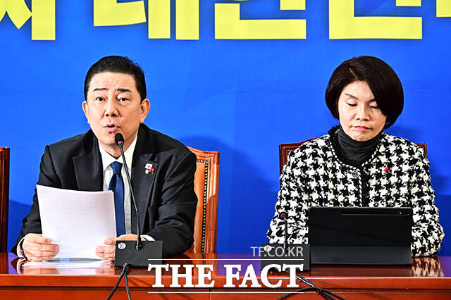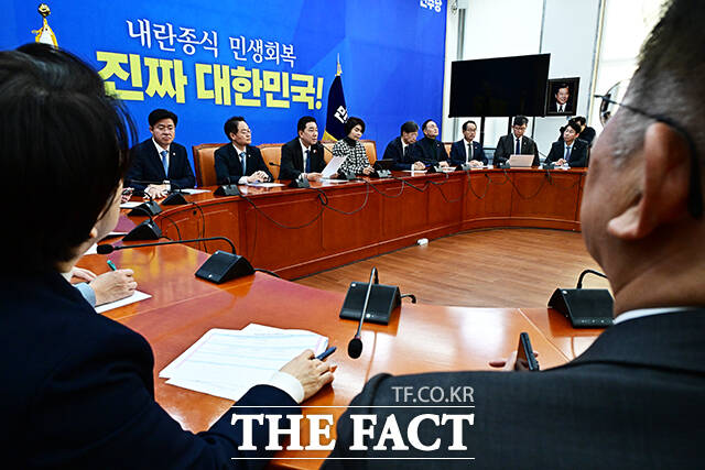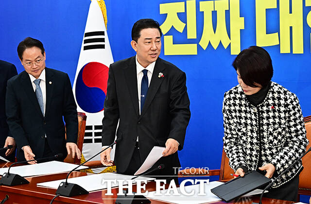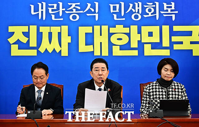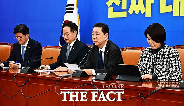 [더팩트ㅣ국회=배정한 기자] 김병기 더불어민주당 원내대표(가운데)가 18일 오전 서울 여의도 국회에서 열린 정책조정회의에 참석해 모두발언을 하고 있다.