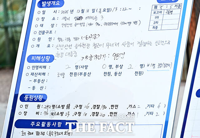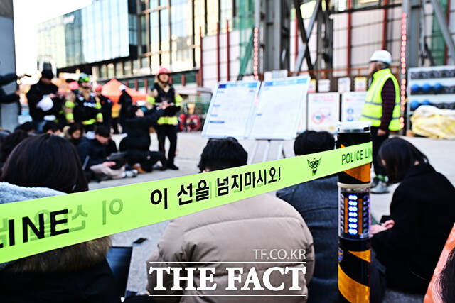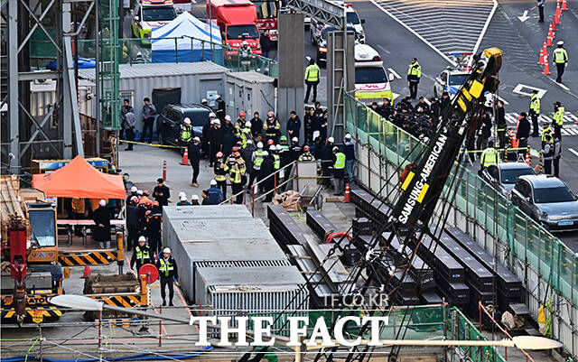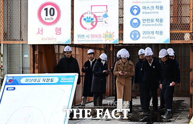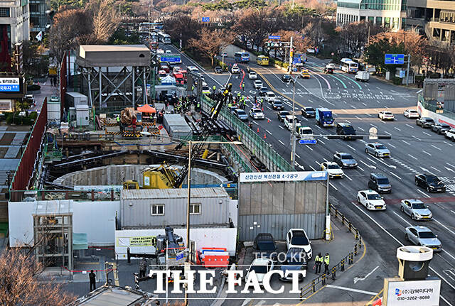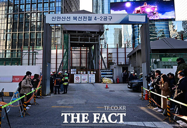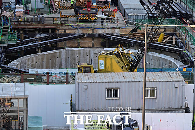 [더팩트ㅣ배정한 기자] 18일 오후 포스코이앤씨가 시공하는 서울 여의도역 신안산선 공사현장 지하 70m 지점에서 철근이 무너지는 사고가 발생한 가운데 관계자들이 현장을 점검하고 있다.