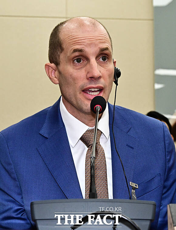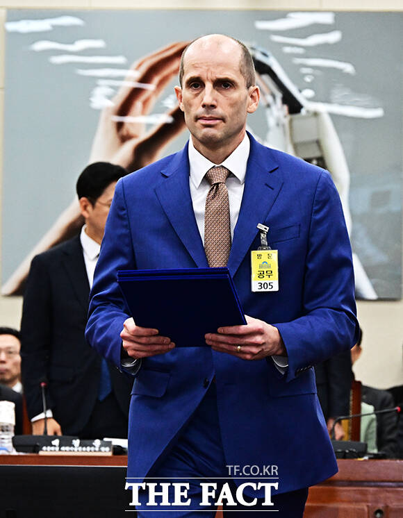 [더팩트ㅣ국회=배정한 기자] 해롤드 로저스 쿠팡 대표이사가 31일 오전 서울 여의도 국회에서 열린 ‘쿠팡 침해사고 및 개인정보 유출, 불공정 거래, 노동환경 실태 파악과 재발방지 대책 마련을 위한 청문회’에 증인으로 출석해 사나운 표정으로 의원들의 질의에 답변을 하고 있다.