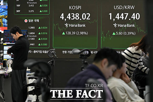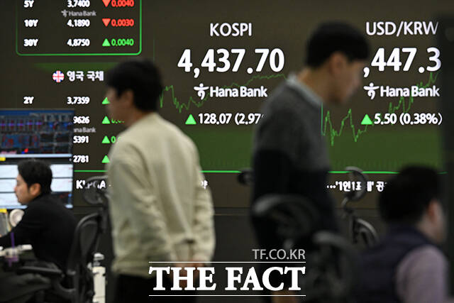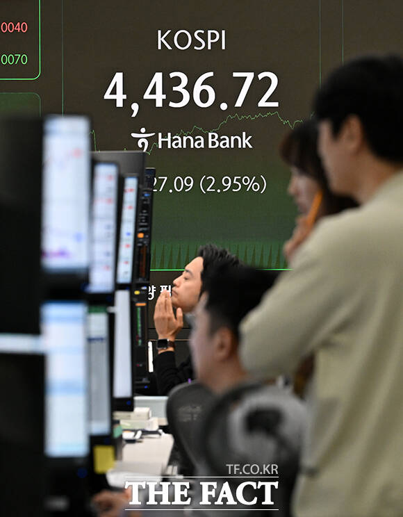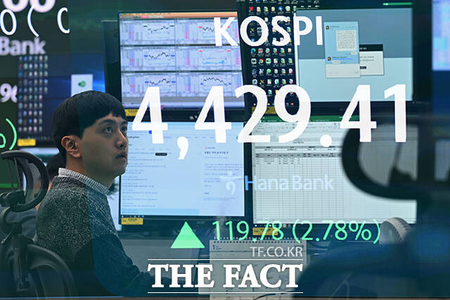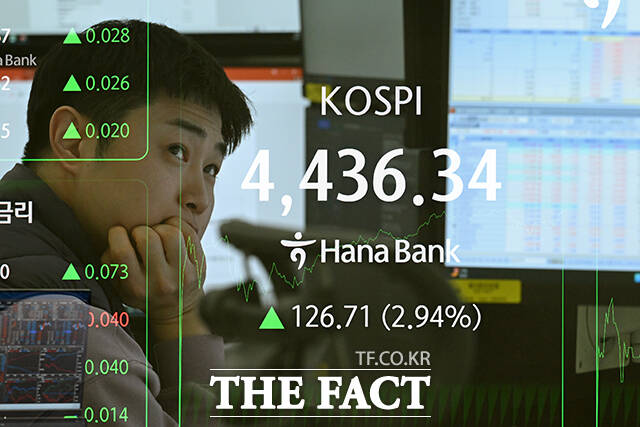 이날 오후 1시 36분 기준 코스피는 전 거래일 대비 3.00% 오른 4438.93을 기록했다. 전장 대비 1.77% 뛴 4385.92로 출발한 지수는 상승 폭을 키우며 장중 한때 4447.52까지 치솟아 장중 사상 최고치를 다시 한번 갈아치웠다.