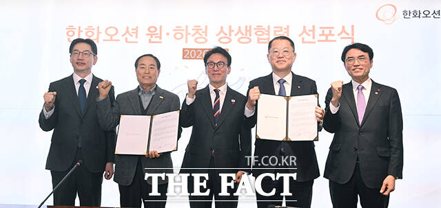 [더팩트ㅣ임영무 기자] 김민석 국무총리(가운데)가 5일 오후 서울 중구 한화오션 서울사무소에서 열린 한화오션 원·하청 상생협력 선포식에 참석해 기념사진을 찍고 있다.darkroom@tf.co.kr사진영상기획부 photo@tf.co.kr