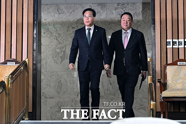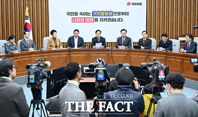 [더팩트ㅣ국회=남용희 기자] 송언석 국민의힘 원내대표(가운데)가 6일 오전 서울 여의도 국회에서 열린 원내대책회의에서 발언을 하고 있다.