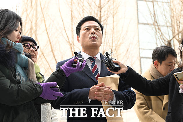 [더팩트ㅣ박헌우 기자] 김태우 전 강서구청장이 6일 오후 서울 마포구 서울경찰청 공공범죄수사대에 강선우 의원의 '공천헌금' 의혹에 대한 고발인 조사에 앞서 입장을 밝히고 있다.