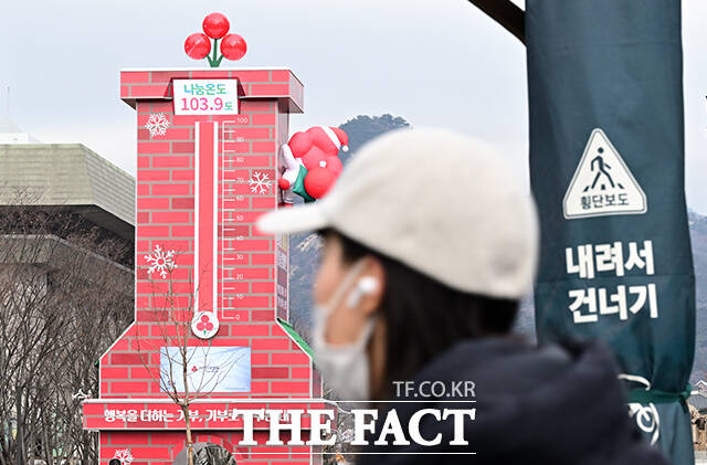 [더팩트ㅣ임영무 기자] 사랑의열매 사회복지공동모금회가 목표액 4500억 원 돌파를 밝힌 12일 오전 서울 광화문 광장에 설치된 사랑의 온도탑이 103.9도를 기록하고 있다.