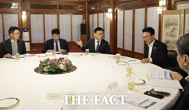 [더팩트ㅣ임영무 기자] 김민석 국무총리가 20일 오전 서울 종로구 삼청동 총리공관에서 박상진 산업은행 회장과 간담회를 갖고 있다.