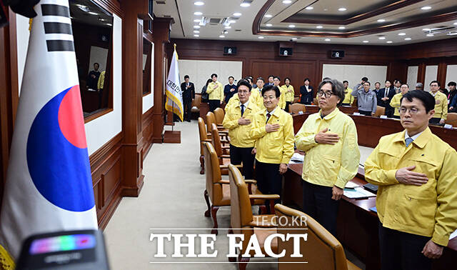 [더팩트ㅣ임영무 기자] 김민석 국무총리를 비롯한 국무위원들이 20일 오후 서울 종로구 정부서울청사에서 열린 국가테러대책위원회 회의에 참석해 국기에 대한 경례를 하고 있다.darkroom@tf.co.kr사진영상기획부 photo@tf.co.kr