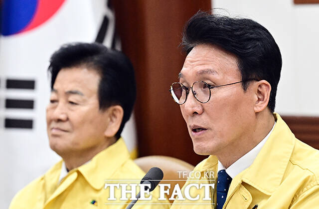 김민석 국무총리(왼쪽)가 20일 오후 서울 종로구 정부서울청사에서 열린 국가테러대책위원회 회의에 참석해 모두발언을 하고 있다. /임영무 기자