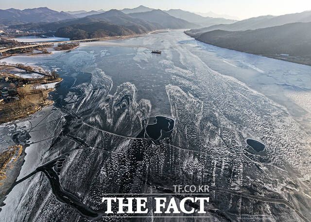 [더팩트|양평=박헌우 기자] 전국 대부분 지역에 한파특보가 내려진 21일 오전 경기 양평 두물머리 인근 남한강이 얼어있다.