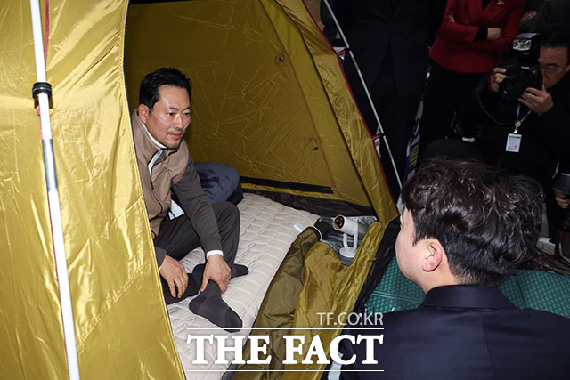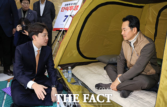 [더팩트ㅣ국회=남용희 기자] 이준석 개혁신당 대표가 21일 오전 서울 여의도 국회 로텐더홀에서 단식투쟁 7일차를 맞은 장동혁 국민의힘 대표를 찾았다.