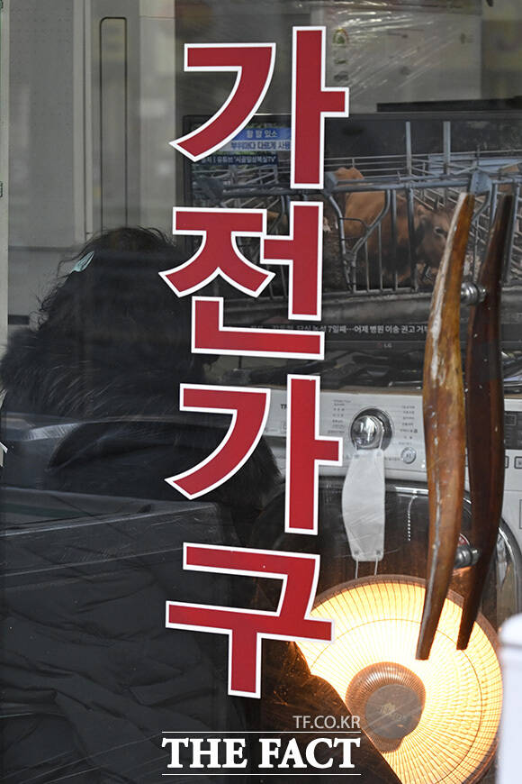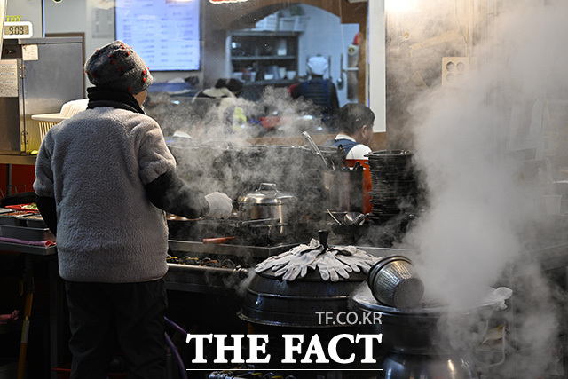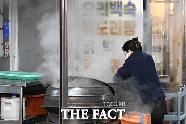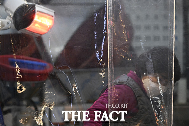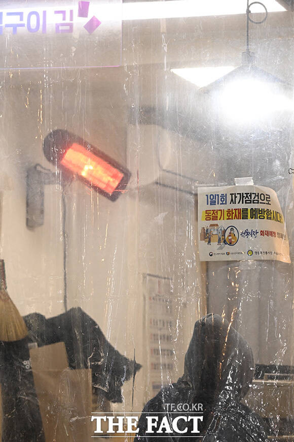 [더팩트 | 송호영 기자] 전국 대부분 지역에 한파특보가 내려진 21일 오전 서울 영등포구 영등포중앙시장의 한 상인이 강추위에 온열기구를 틀고 있다.