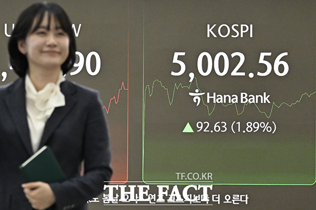 코스피가 사상 최초로 장중 5000선을 돌파한 22일 오전 서울 서울 중구 하나은행 본점 딜링룸 전광판에 지수가 표시되고 있다. /송호영 기자