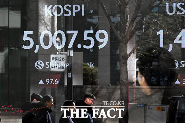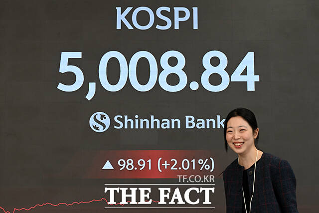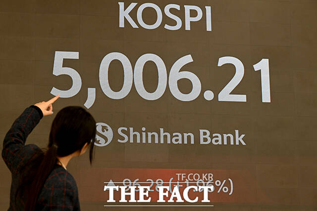 한국거래소에 따르면 이날 코스피는 지수는 전장보다 77.13포인트(1.57%) 오른 4,987.06으로 출발해 상승폭을 키워 5,000선을 넘어섰다. 장중에는 한때 5019.54까지 치솟기도 했다.