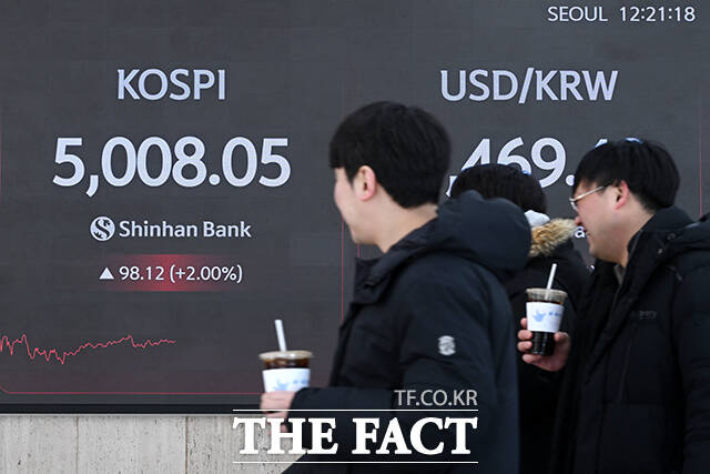 [더팩트ㅣ서예원 기자] 코스피가 사상 최초로 5000 고지를 돌파한 22일 오후 서울 중구 신한은행 본점 로비의 전광판에 지수가 표시되고 있다.