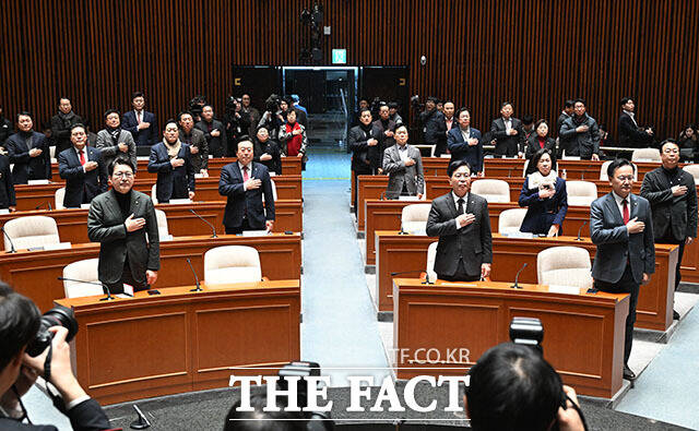 [더팩트ㅣ국회=남용희 기자] 22일 오후 서울 여의도 국회에서 의원총회가 열린 가운데 장동혁 국민의힘 대표의 자리(왼쪽 아래)가 비어있다.