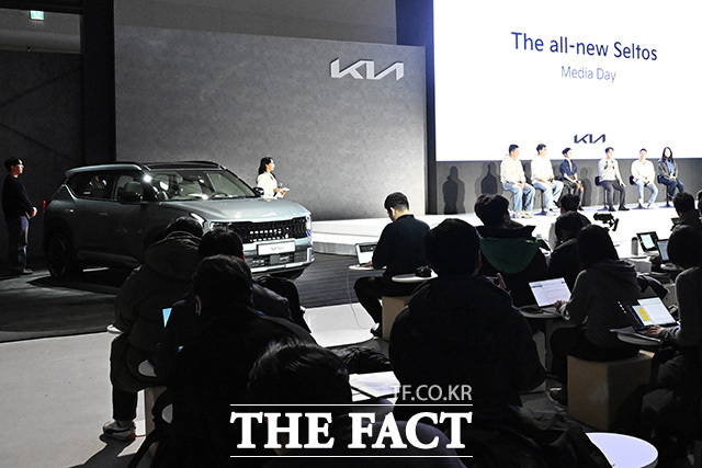[더팩트 | 송호영 기자] 안서희 기아 넥스트디자인외장2팀장과 이민영 기아 넥스트디자인내장1팀장, 장수진 기아 넥스트CMF팀장, 손용준 기아 국내상품1팀장, 정두석 기아 MSV프로젝트4팀장(왼쪽부터) 등 관계자들이 23DLF 오전 서울 중구 동대문디자인플라자 아트홀 1관에서 열린 '디 올 셀토스' 미디어 데이에 참석해 취재진의 질의에 답하고 있다.
