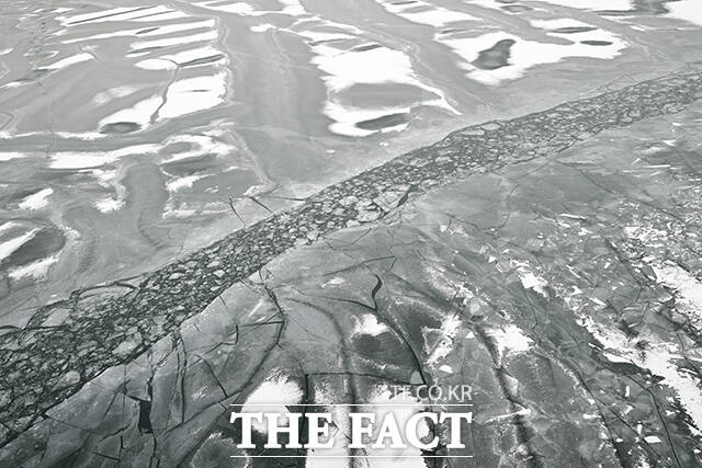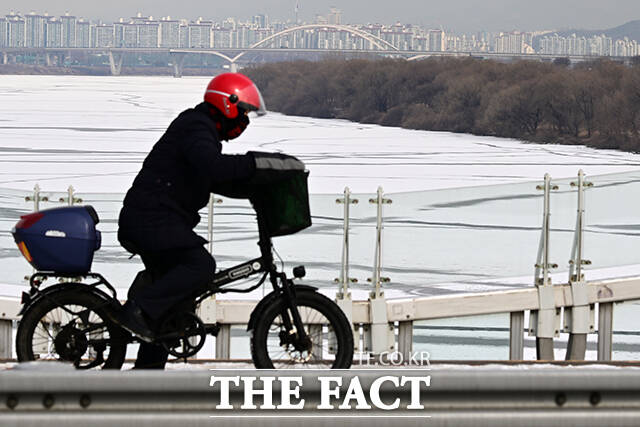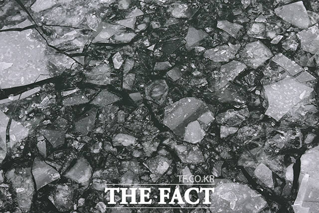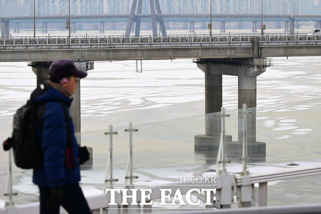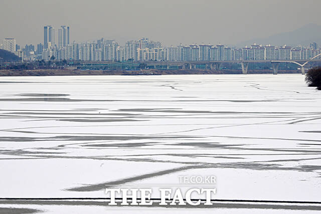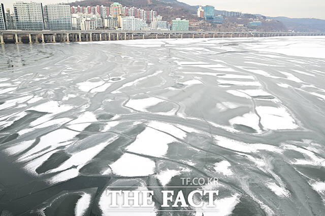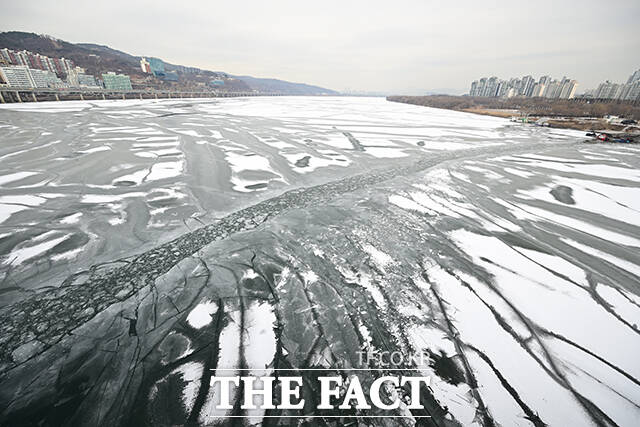 [더팩트ㅣ남윤호 기자] 서울 아침 최저기온 영하 9도로 한파가 찾아온 26일 오전 서울 강동구 광진교에서 바라본 한강이 얼어붙어 있다.
