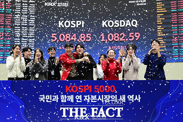 코스피가 사상 처음으로 종가 기준 5000선을 돌파한 채 장을 마감한 27일 오후 서울 여의도 한국거래소 직원들이 세리머니를 하고 있다. 이날 코스피는 전 거래일 대비 2.73% 오른 5084.85로 장을 마감했다. /남윤호 기자